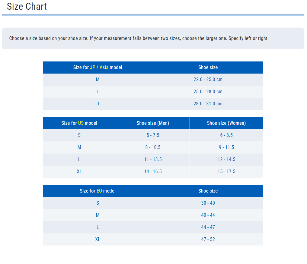 Choose a size based on your shoe size. If your measurement falls between two sizes, choose the larger one. Specify left or right.