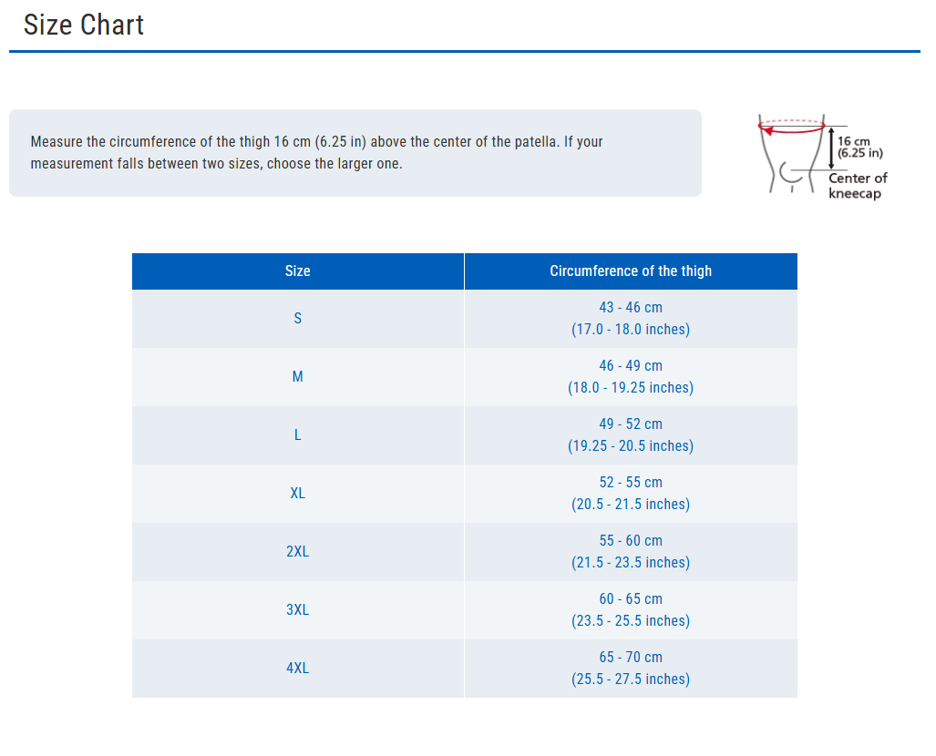 Measure the circumference of the thigh 10 cm (4 in) above the center of the patella. If your measurement falls between two sizes, choose the larger one.